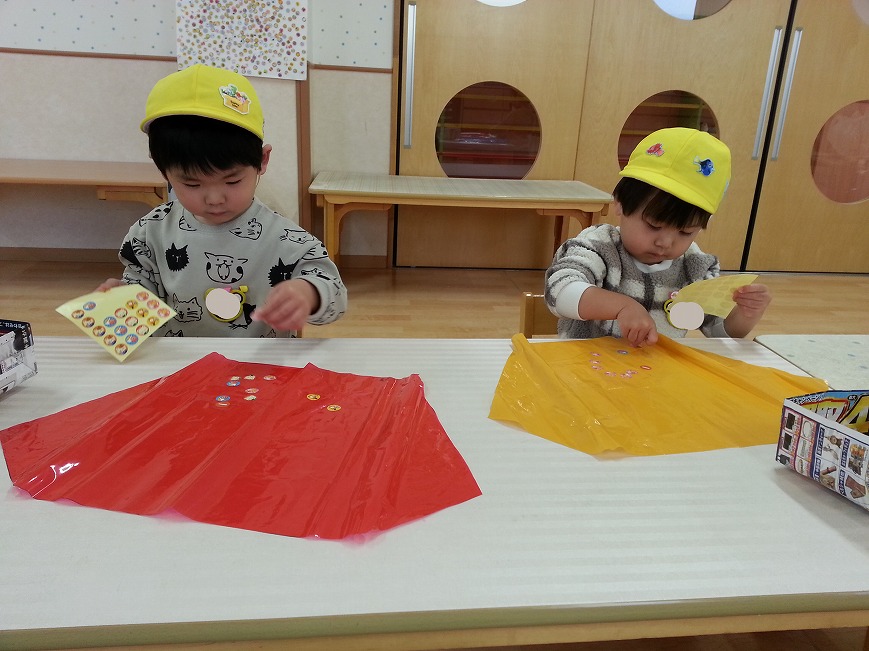 シールを貼ったり、マジックでぐるぐる~とお絵描きをして、オリジナル凧を作りました!