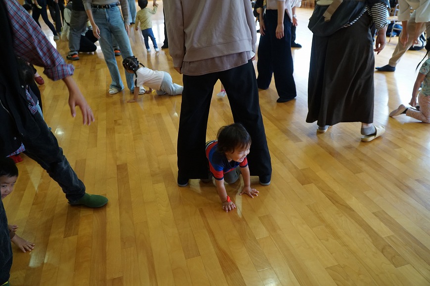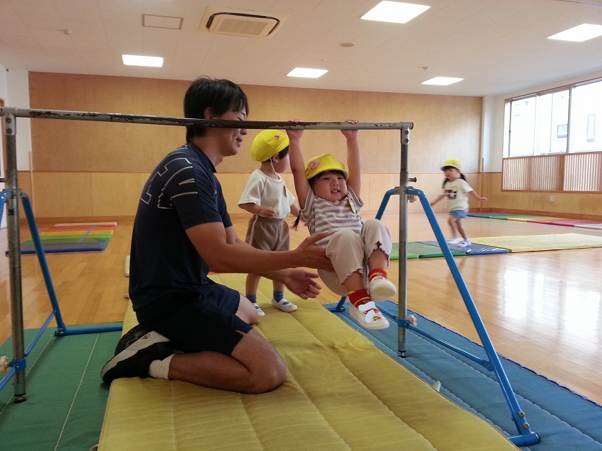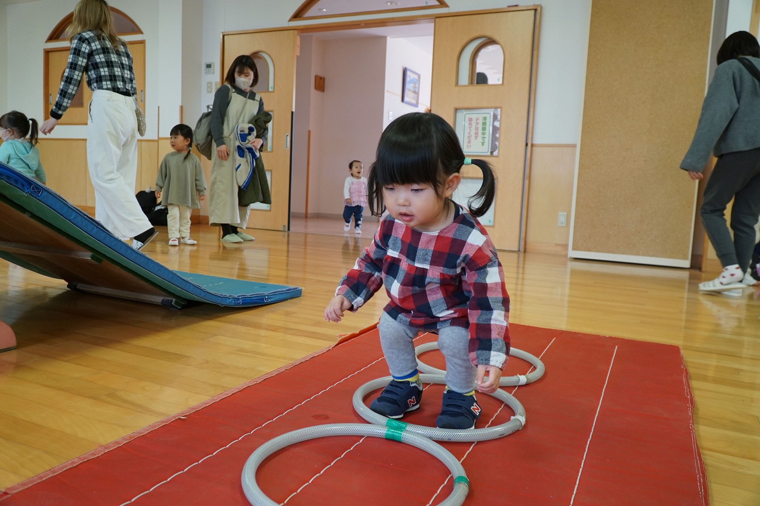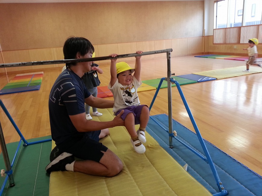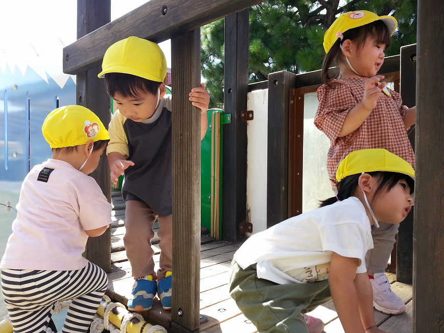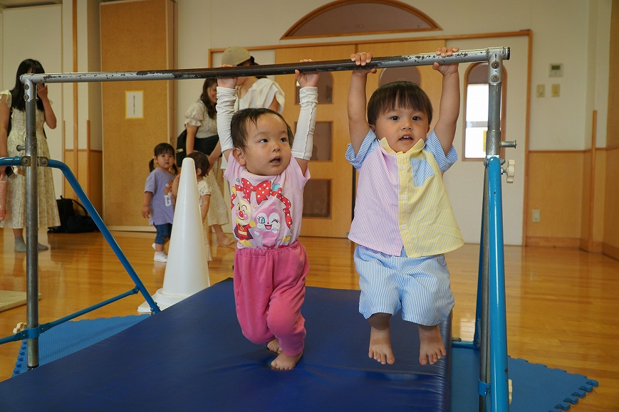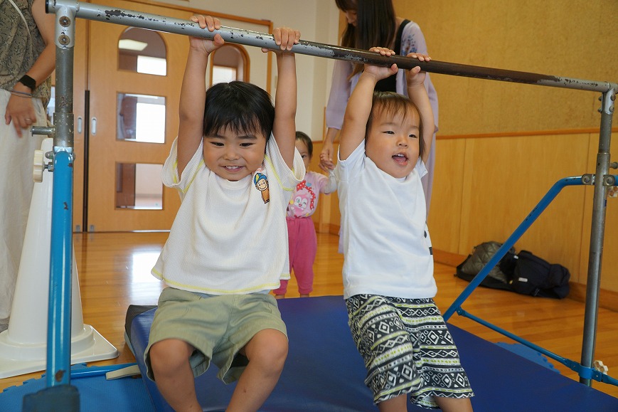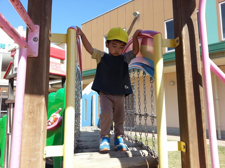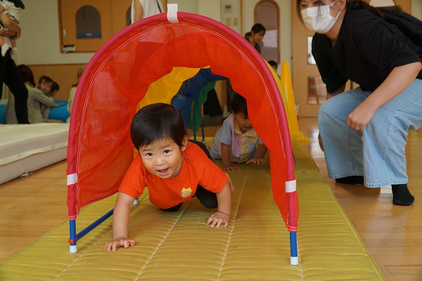 鉄棒でおさるさんのようにぶらさがったり、トンネルをくぐったりと、