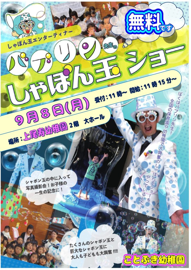 2学期初めのことぶき広場は9月8日(月)しゃぼん玉ショーを行います!