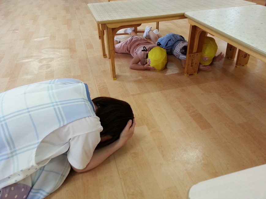 地震を想定し、机の下にもぐって頭を守る練習をしました🫡