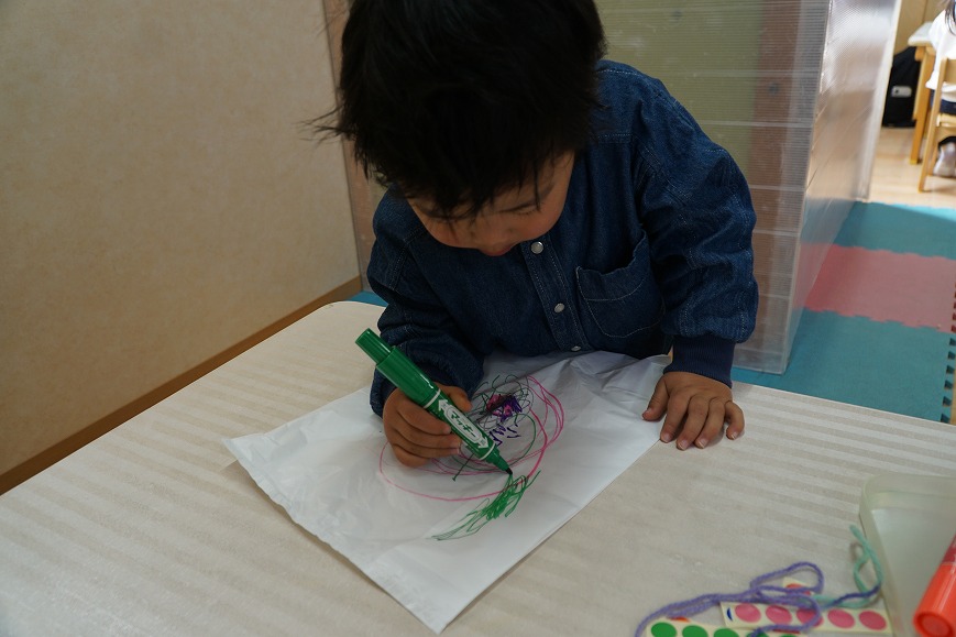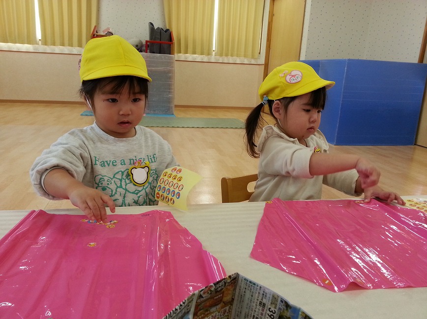 シールを貼ったり、マジックでぐるぐる~とお絵描きをして、オリジナル凧を作りました!